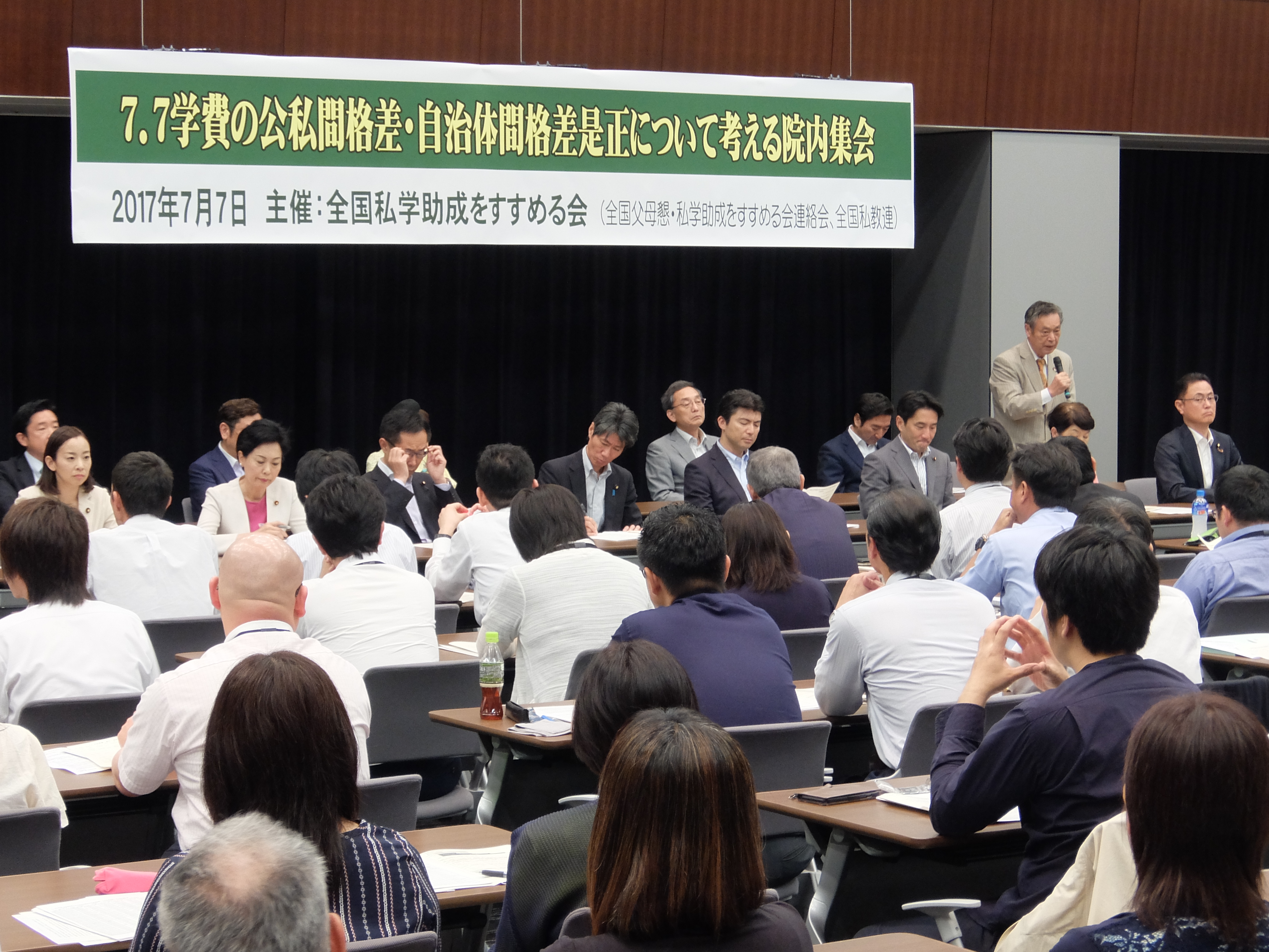 全国私学助成をすすめる会が主催する「7.7学費の公私間格差・自治体間格差是正について考える院内集会」が国会内で開催されました。