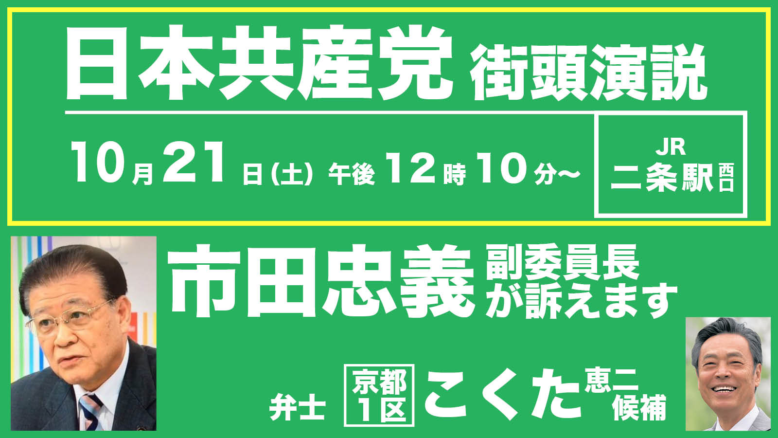 21日、12:10からのJR二条駅での街頭演説に市田忠義副委員長が、こくた恵二の小選挙区京都1区での必勝の訴えに駆けつけます。