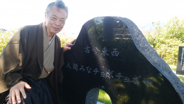 「人」の字をモチーフにしたモニュメントには、「古今東西 人間みなチョボチョボや」との言葉が刻み込まれています。