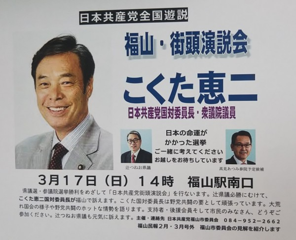 17日(日)・14時から広島県福山市の福山駅南口で「県議選・参議院選挙勝利をめざす 日本共産党街頭演説会」が開催されます。