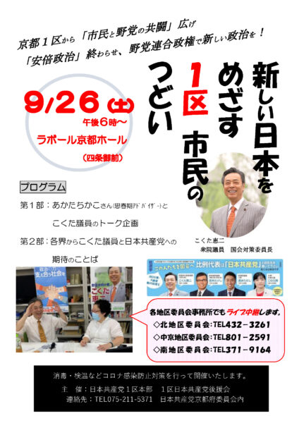 【お知らせ】本日26日・18時から「新しい日本をめざす京都1区・市民のつどい」を開催