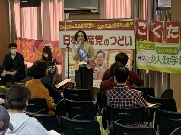 保育士として働く青年は、「コロナ感染を絶対に出さないように、緊張と不安の中で一生懸命に保育に取り組んでいます」など保育現場の実情、「ギッリギリの労働条件で仲間が頑張っている」と切々と訴え。「政治を変えないとこうした現状は改善しない」と国会要請行動を行った経験を報告し、「この時、私たちの願いに正面から応えてくれたのが日本共産党と、こくた議員」と党躍進への期待を語っていただきました。