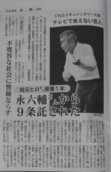 KTS鹿児島テレビが制作した「テレビでは会えない芸人」がFNSドキュメンタリー大賞を受賞。その「テレビで会えない芸人」とは「憲法くん」のコントで知られる松元ヒロさんです。