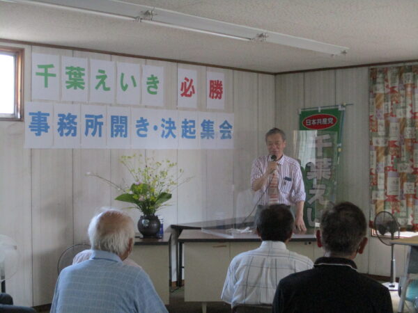 昼食休憩後は「事務所開き・決起集会」で、ふなやま由美・衆院比例東北ブロック予定候補とともに訴えました。