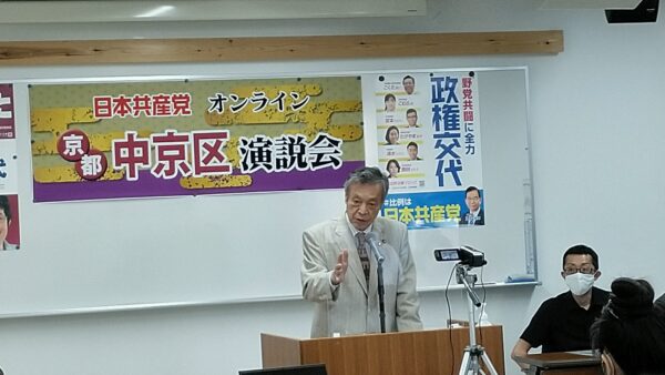 報告です。22日、山城地区演説会を終え、市内に戻り、中京区のオンライン演説会で訴え。