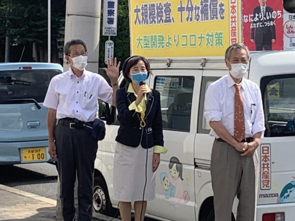 「それにしても、今朝の『京都新聞』トップの記事をご覧になったでしょうか。自民党政権による公衆衛生の削減政策の中で、京都でも保健所機能の危機的状態は深刻で、長時間労働のため退職者があいつぐ。国民のいのちを蔑ろにする自民党政治の転換は待ったなしではないでしょうか」と訴えました。