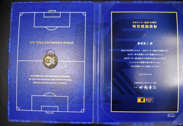 報告です。 日本サッカー協会(JFA)の田島幸三会長から、日本サッカー協会 100周年「特別感謝表彰」が届きました。