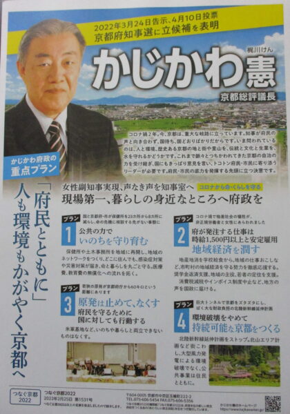 3月24日告示・4月10日投開票の京都府知事選に挑戦する、かじかわ憲・京都総評議長の政策・プロフィールなどを紹介する新しいリーフレットが完成しました。ぜひ、ご覧ください。