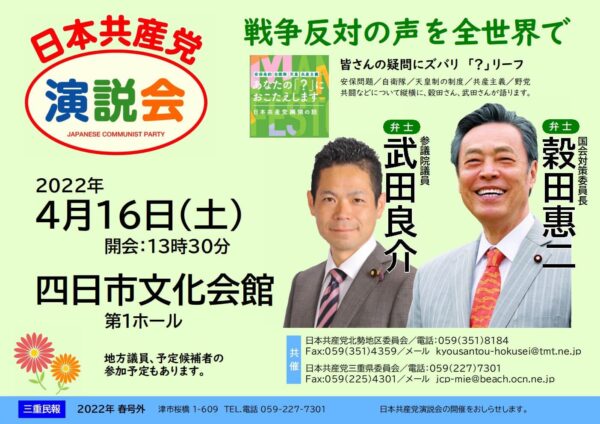 【お知らせ】です。 16日・13時半から開催される三重県四日市市の文化会館で開催される「日本共産党演説会」に駆けつけ、たけだ良介参院議員(比例東海ブロック予定候補)とともに訴えます。