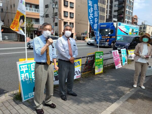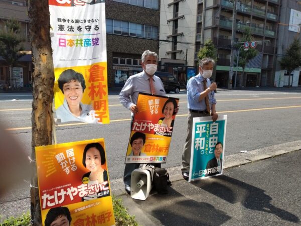 報告です。19日、下京区の京都水族館前と西大路花屋町スクウェア前で西脇いく子府会議員、かまの敏徳市会議員とともに、街頭宣伝を行い、参議院選挙での日本共産党の躍進を訴えました。