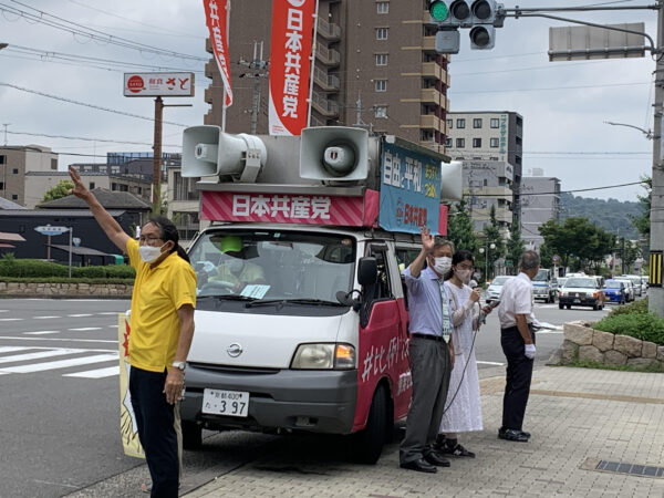参院選も最終盤。17日目の7月8日の午前は、京都市南区全域を井上けんじ、森田ゆみ子の両京都市会議員、森よしはる京都府会予定候補と一緒に3時間にわたり「政党カー」でまわり、10カ所で街頭演説を行いました。