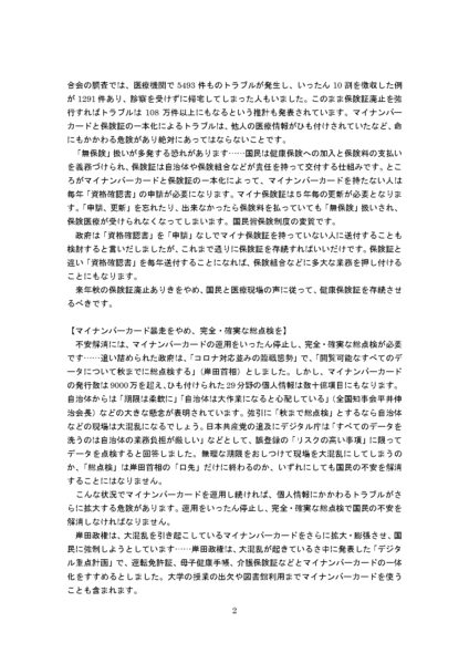 大量の個人情報をビジネスに利用しようとする特定企業の利益を後押しする動きが加速しました……安倍政権以来、政府は個人情報保護法を改悪し、保護規定を弱め、逆に個人情報の利活用を拡大してきました。これも財界の要求で、日本経団連は「マイナンバー制度を徹底活用する」ために「健康保険証、運転免許証、在留カード等の公的証明書、また診察券や学生証等のデジタル化とマイナンバーカードへの一元化」(2020年「新成長戦略」)を求めています。個人情報ビジネスを推進するために、当初は検討もされていなかった健康保険証廃止とマイナンバーカードとの一本化をはじめ、膨大な量の個人情報を次々にひも付けているのです。マイナンバー制度を利用した個人情報ビジネス最優先の方針や計画を見直し、根本的な政策の転換が求められます。