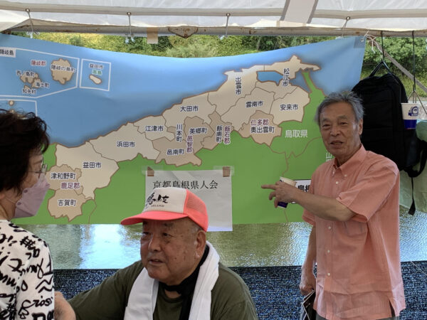 連れ合いの出身地、「京都島根県人会」では、テントのなかで、みなさんと談笑。島根県の地図を記した横断幕。
