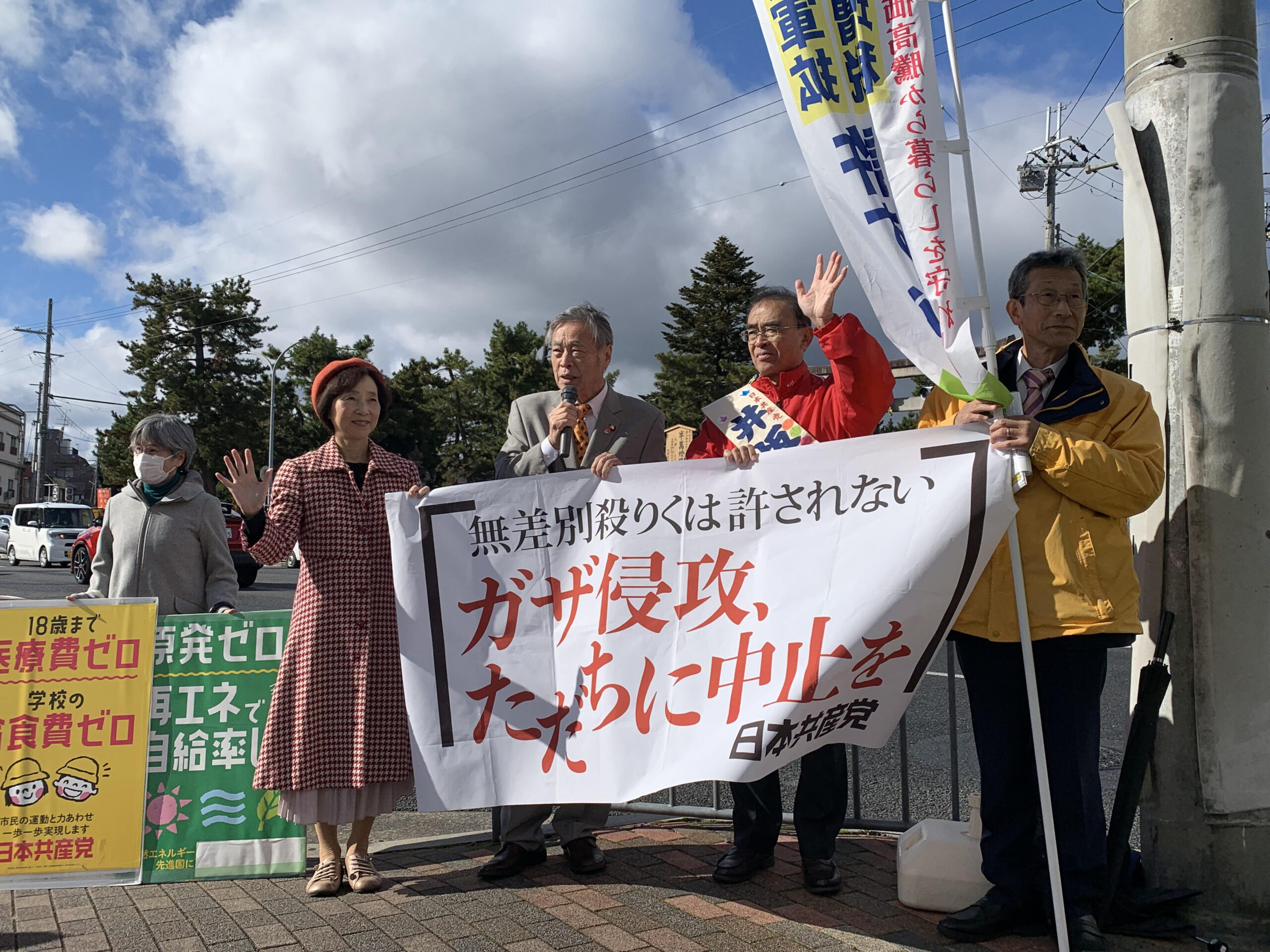 また、国会での補正予算に関連して、「なぜ、大阪万博への予算700億、マイナシステムへ800億が計上されているのか。これが、補正予算、すなわち緊急に必要な予算と言えるか」と痛烈に批判。「8100億もの軍事費も計上されている。これをめぐって、政党の構図もハッキリとしてきた。こんな大軍拡、国民生活破壊の予算、無駄遣いの予算に対し、維新は万博だと言い、国民民主党はトリガー条項の凍結解除だと言って賛成する。この点でも悪政4党連合の姿が浮き彫りになった。やっぱり、日本共産党の躍進が求められている」と訴えました。