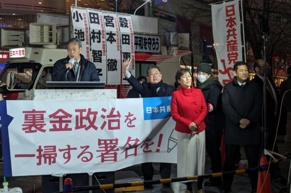 28日、共産党国会議員団「自民党裏金問題追及」緊急宣伝@有楽町//『動画』も。
