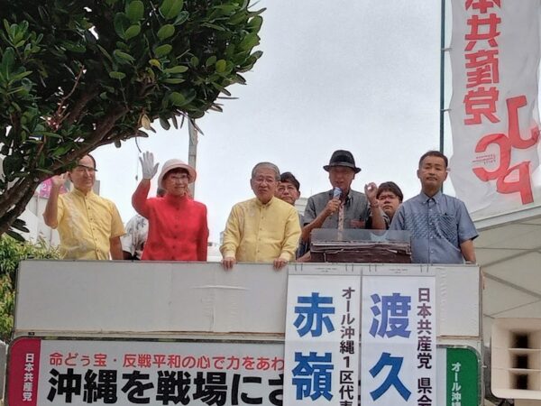 赤嶺氏は、自民党が県議選で名護市辺野古の米軍新基地建設や、沖縄をはじめ南西諸島の軍事要塞化について、一切口をつぐんでいた。岸田自公政権が進める新基地建設の完成や遺骨土砂の使用、「有事」の際に先島諸島から住民を避難させる計画などの問題は全く見通しが立っていないと主張。「日本共産党は、4人の県議団を中心に公約実現に奮闘し、『オール沖縄』の団結強化に力を尽くす」と決意を述べました。
