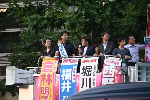 「こうした腐りきった岸田自公政権に「ノー」の審判を、東京都知事選挙では蓮舫さんの勝利で、京都では中京区の福井ひでとしさんの勝利で下そうではありませんか」訴えました。