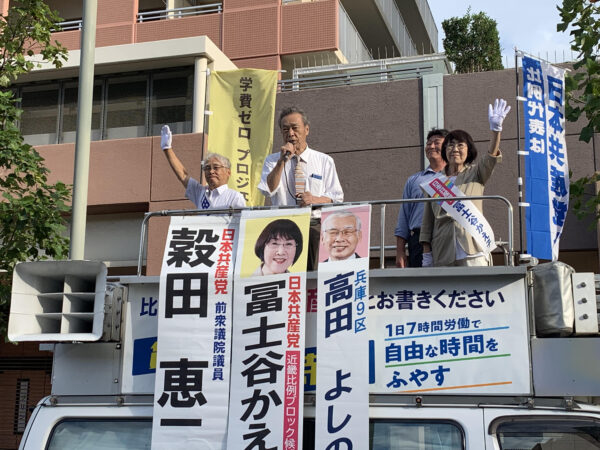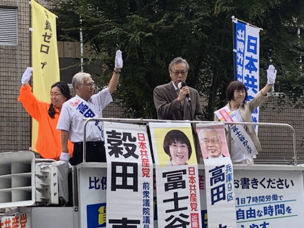 「兵庫9区から、金権腐敗政治一掃の確かな力、日本共産党を躍進させ、政治に信頼を取り戻そうではありませんか」と呼びかけました(写真は、左から、私、高田よしのぶ兵庫9区候補、冨士谷近畿比例候補)。