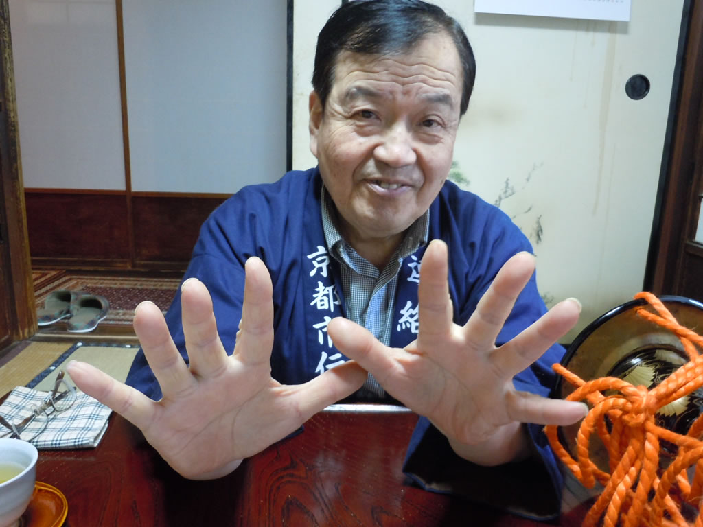 これは、麻団子です。この麻に含まれた水で手の感覚を調整しています。まさに手仕事です。手の写真を撮られたのは初めてですな。少し小さいけれど柔らかい、そして湿った手です。
