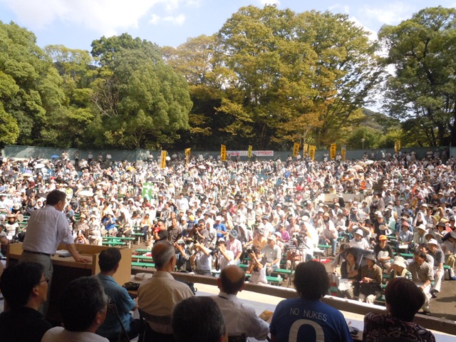 京都の円山音楽堂で開催の「9・10原発NO!! 京都府民大集会」に駆けつけた。”秋晴れ”のというか、猛烈な暑さのなかの集会だった。もちろん熱気あふれる集会で暑さも吹き飛ばし、会場は2,600人の参加で大いに盛り上がった。