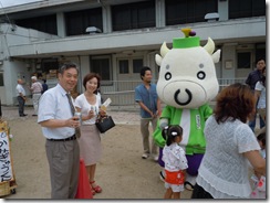 牛のマスコットは、上京区の「ゆるキャラ」の「かみぎゅうくん」。さっそく記念撮影。防犯グッツの啓発活動などにも取り組んでいて、説明を受けました。