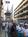 祇園囃子(ばやし)が響く中、子どもらが綱を引いて巨大な鉾を動かし、祭りの雰囲気を一足早く高めました。上の写真は、四条室町下がるの鶏鉾の曳初めの様子です。