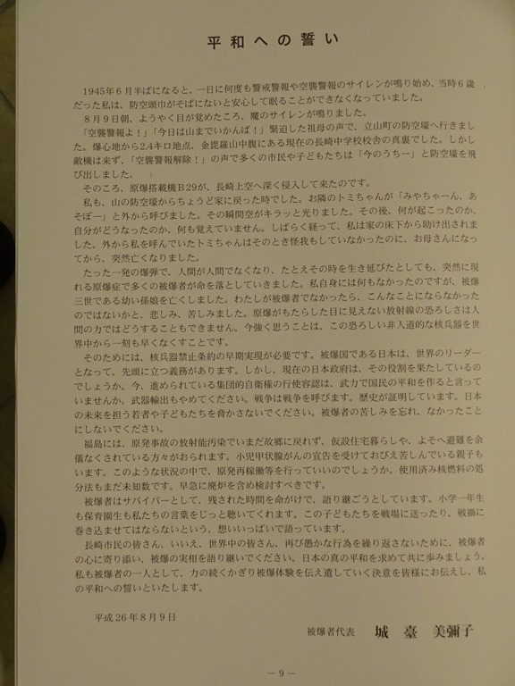被爆者代表の城臺美彌子さん「平和の誓い」も、涙なしでは拝聴することが出来ませんでしたし、集団的自衛権の件の発言は、「集団的自衛権の行使容認は、日本国憲法を踏みにじった暴挙です」と厳しく断じた発言は戦争を許さない憲法を守る道を説く、決意に満ちたものでした。