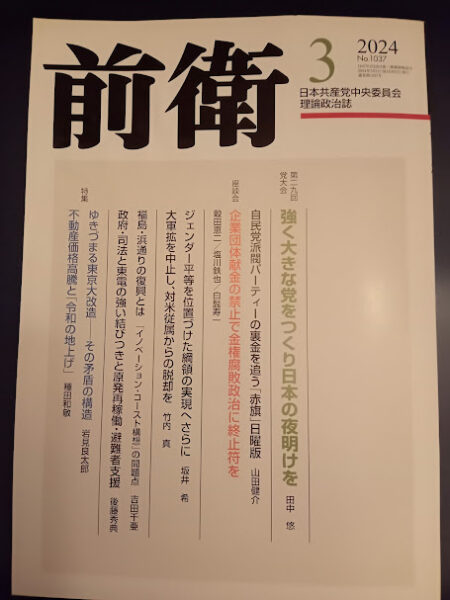 8日、発売の日本共産党の理論政治誌『前衛』には、「座談会 『企業団体献金の禁止で金権腐敗政治に終止符を』」が掲載されています。(塩川鉄也衆院議員、白髭寿一党国会議員団事務局次長、私の鼎談となっています。塩川事務所、前衛編集部にお世話になりました。)